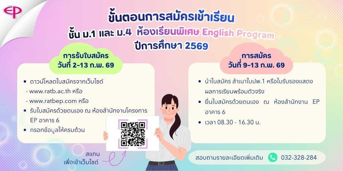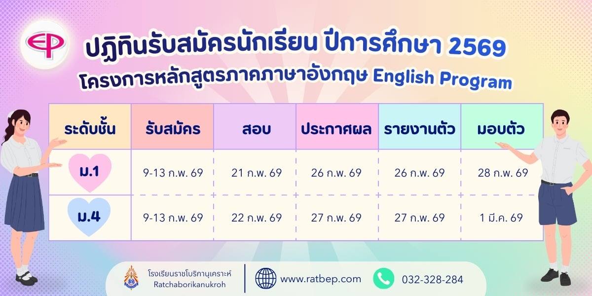( 15 ม.ค. 69 ) - ประกาศรายชื่อผู้มีสิทธิ์สอบคัดเลือกบุคคลเพื่อเป็นลูกจ้างชั่วคราว ตำแหน่งครูอัตราจ้างวิชาวิทยาศาสตร์ (โครงการหลักสูตรภาษาอังกฤษ) จำนวน ๑ อัตรา (ประเภทจ้างเหมาบริการ)