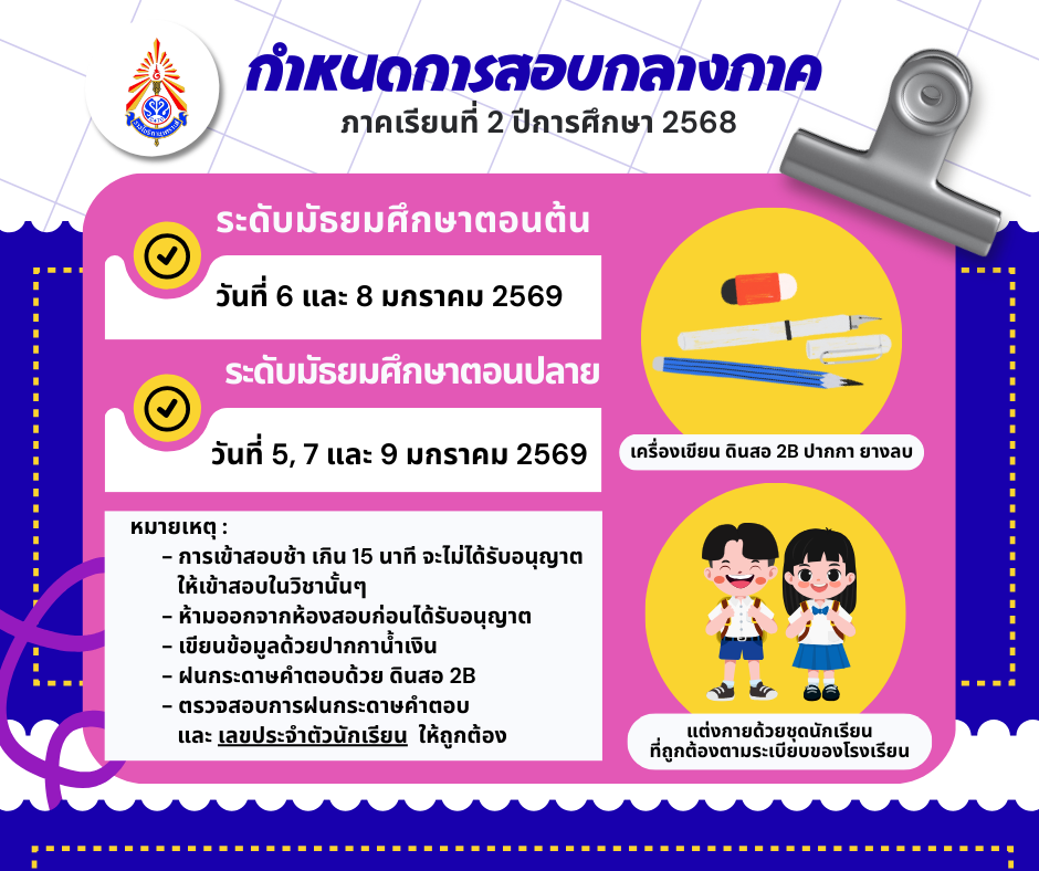 ( 03 ก.ย. 68 ) - แจ้งรายละเอียดการสอบและกำหนดการสอบกลางภาค ภาคเรียนที่ ๑ ปีการศึกษา ๒๕๖๘